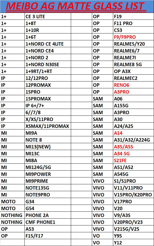 Meibo AG Matt Tempered Glass Price, List, Updated Model List 2025